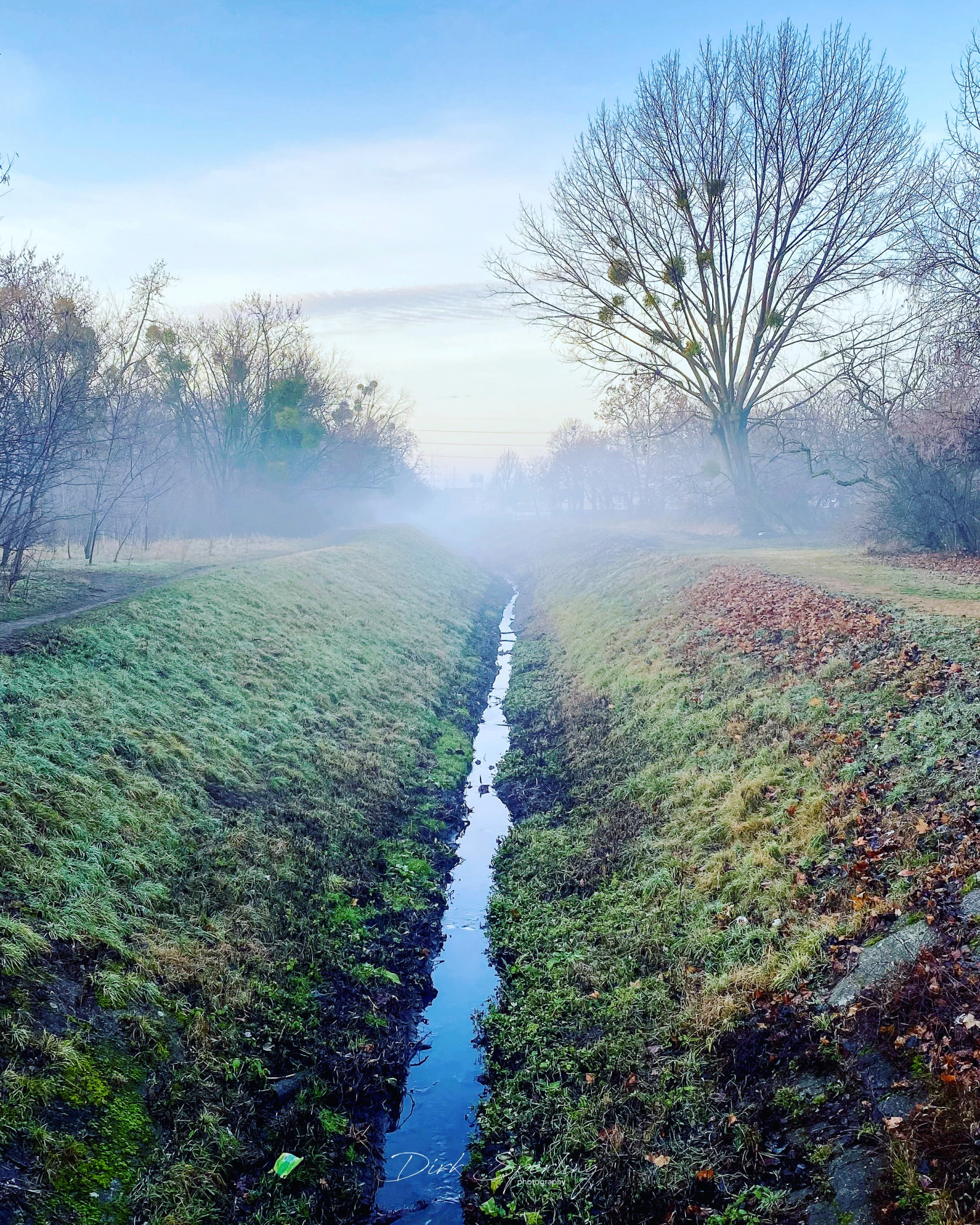 An diesem Tag gab es den ersten Schnee und verwandelte die Landschaft. Licht und Schatten spielen hier mit den Silhouetten der Baumreihe am Feldrand.