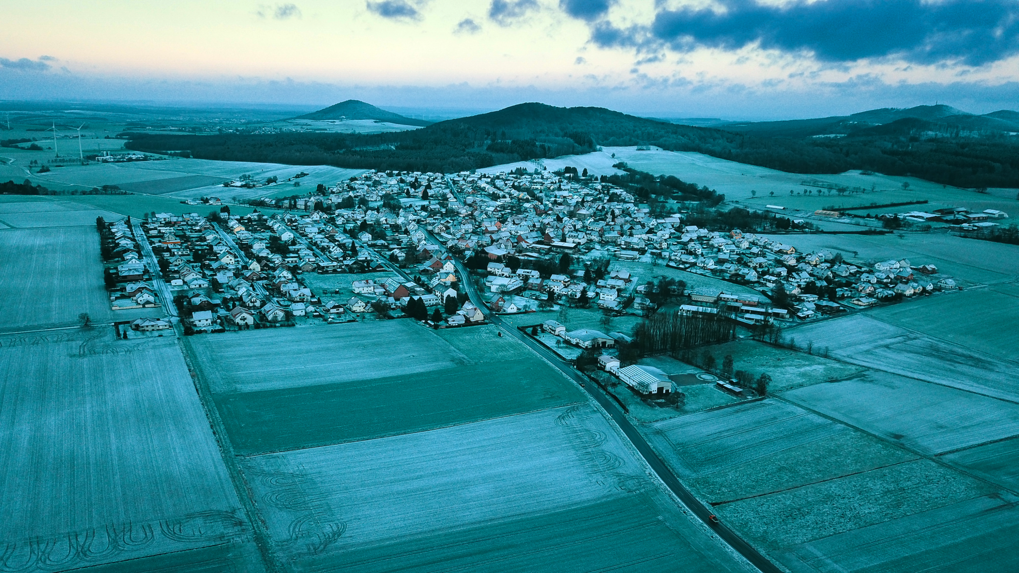 Frost überzieht das kleine nordhessische Dorf Martinhagen. Meine Heimat. Foto aufgenommen mit DJI Phantom 4 Pro